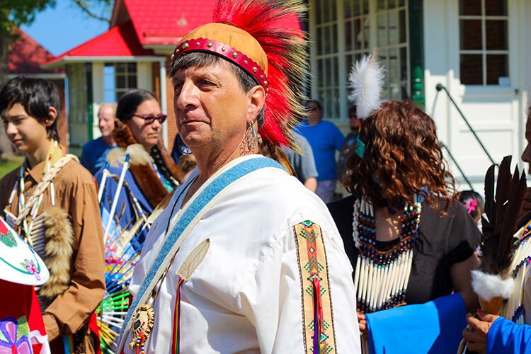 Adrian Harjo, the Master of Ceremonies for the pow-wow traveled from Kansas to be a part of the event. He shared a brief history of his tribe, the Kickapoo/Seminole, and its connection to the Blue Water Area.