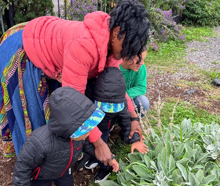 Lorna Parks, owner of House of Joy Childcare in Detroit, takes two of her children to visit the Keep Growing Detroit Garden.