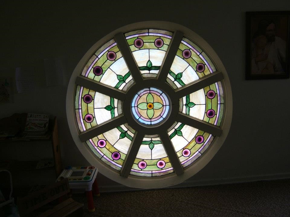 Donny Burton has completely restored dozens of churches. Stained glass reinforces the Nicene Creed excerpt of “…God from God, Light from Light…”