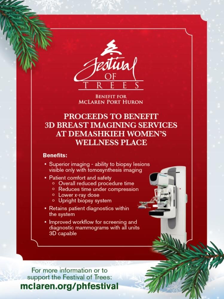 This year, funds raised from the 33rd annual Festival of Trees will be used to help purchase equipment to enhance breast imaging services in the Demashkieh Women’s Wellness Place at McLaren Port Huron. The Hologic Upright Breast Biopsy Guidance system features 3D stereotactic biopsy capabilities, which enhances imaging capabilities and creates a better patient experience. With the Hologic system, physicians will be able to biopsy lesions that are only visible with tomosynthesis imaging, while delivering a lower X-ray dose and reducing a patient’s time under compression.