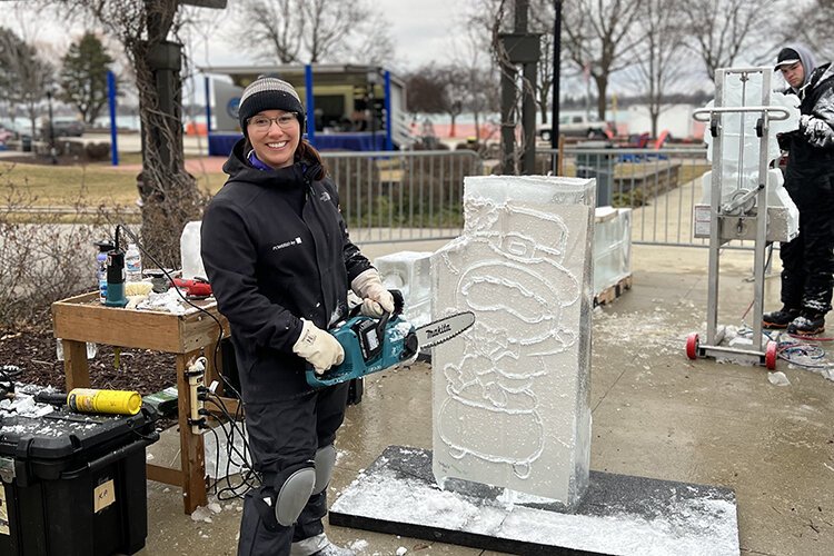 Katlin Pfroffer poses for a photo while working on her ice sculpture during St. Clair's Icy Bazaar.