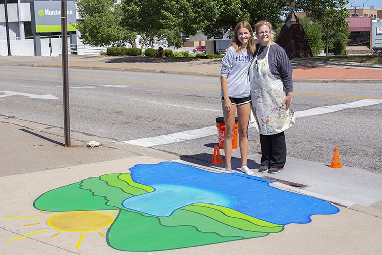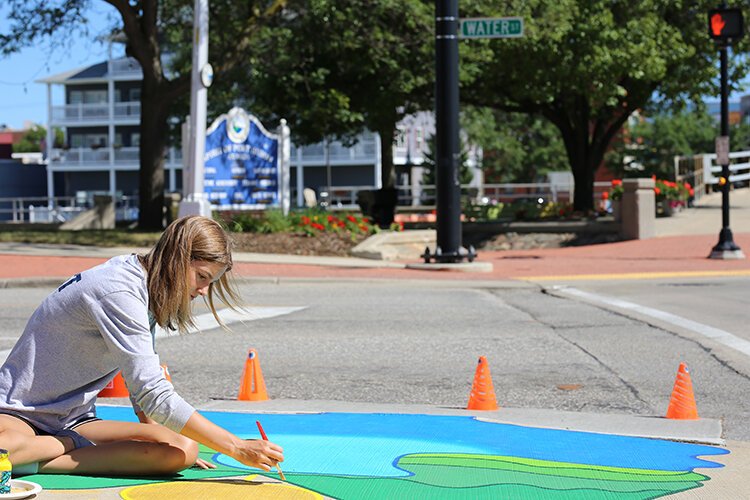 Kayla Faust, a 10th grader at Port Huron Northern High School, participated in the project. Her vibrantly-colored, shimmery artwork features a sun, mountains, hills, and a waterfall that empties into a lake that flows down to the storm drain at the corner of Water and Military Street in downtown Port Huron.