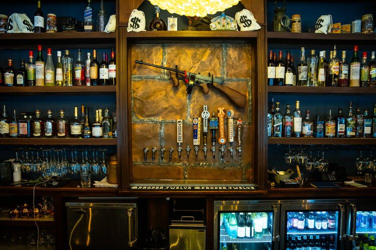 Walking in, the Speakeasy boasts A 120-year-old ceiling with flame-lit bulbs, an antique copper-plated bar with hand-built shelves, as well as a 75-year-old Tommy Gun mounted on the wall behind the bar.