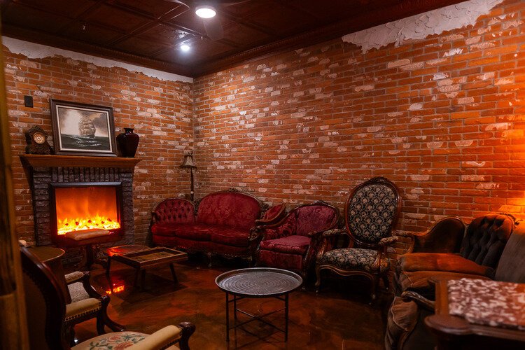 Large, plush leather furniture with pillows and blankets is arranged for people to relax by one of their many fireplaces, and enjoy specialty drinks and cocktails made with bourbons, gins, vodkas, and tequilas. They also have personal laundry bins for folks who want to store their own liquor for next time for $10 a month.
