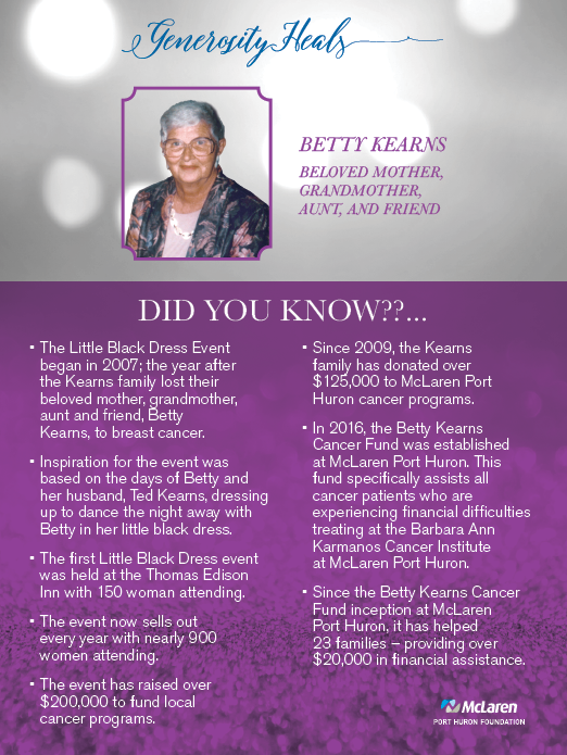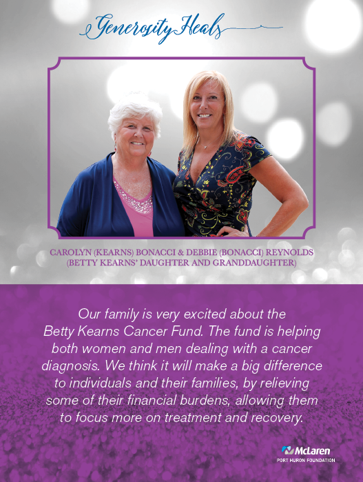 The Kearns family also established the Betty Kearns Cancer Fund through McLaren Port Huron Foundation. The fund assists patients who are experiencing financial difficulties and are seeking treatment, for any type of cancer, at the Barbara Ann Karmanos Cancer Institute at McLaren Port Huron.
