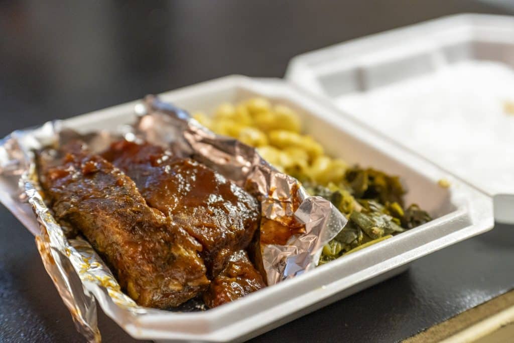 BBQ Rib Dinner: Ribs with side dishes, baked mac and cheese, and collard greens. Harold Powell.