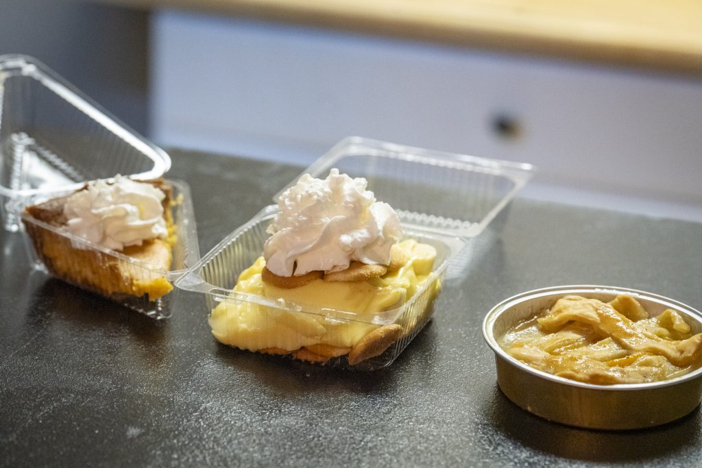 Marcie’s Sweet Potato Pie (left), banana pudding (middle), and mini peach cobbler (right). Harold Powell.
