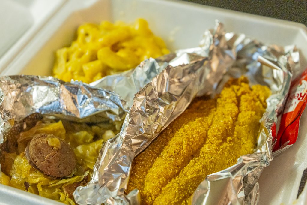 Catfish Filet Dinner: Catfish with side dishes, baked mac and cheese, and cabbage. Harold Powell.