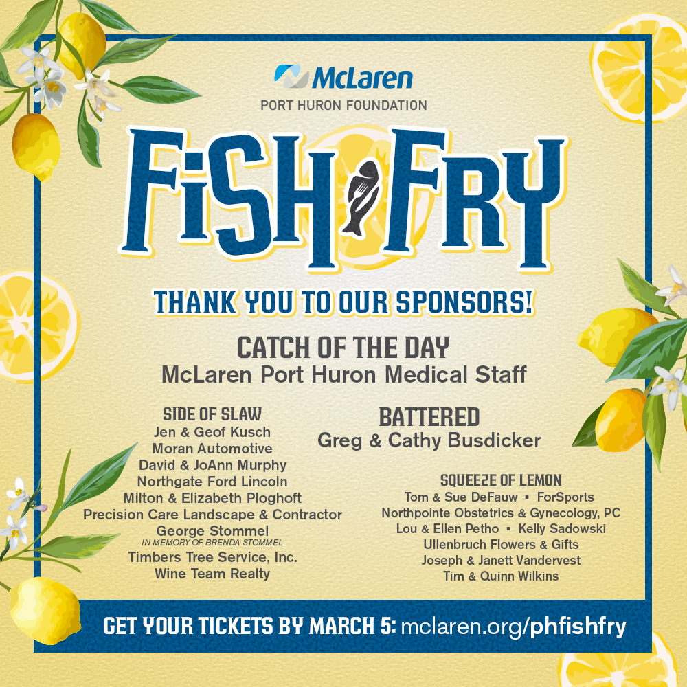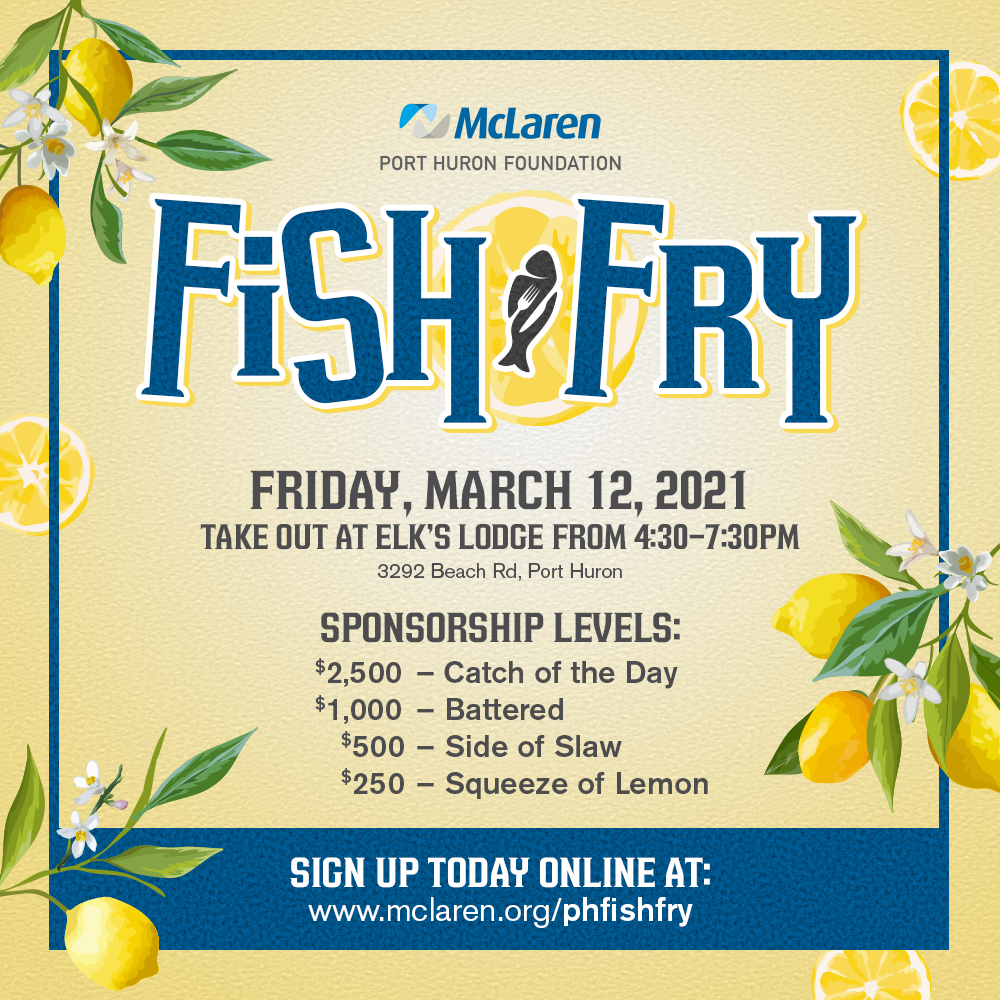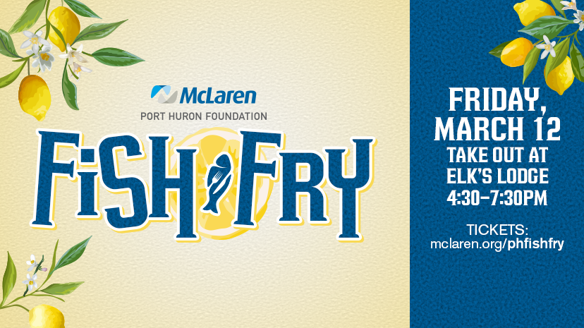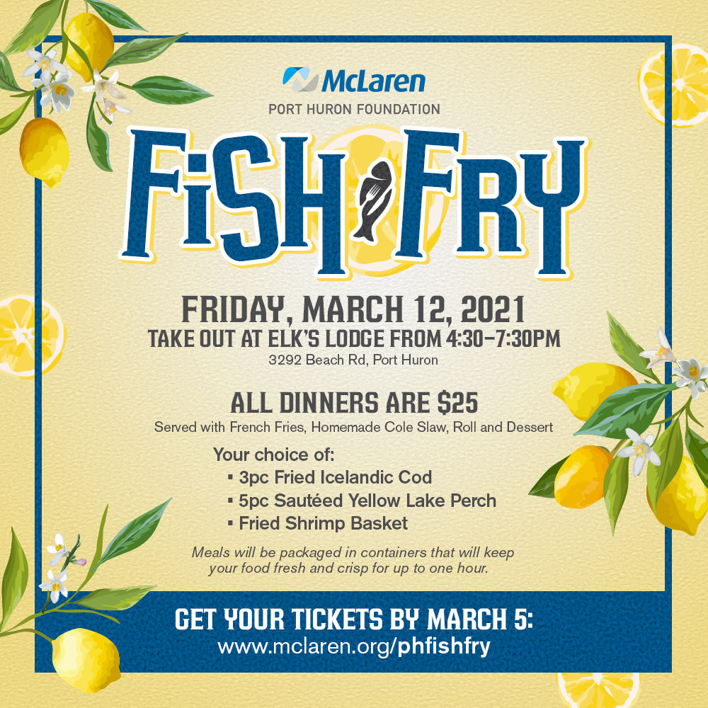 The McLaren Port Huron Foundation Fish Fry is scheduled for Friday, March 12, from 4:30 to 7:30 p.m. Meals can be picked up from Elks Lodge 343, which is located at 3292 Beach Rd. in Port Huron.