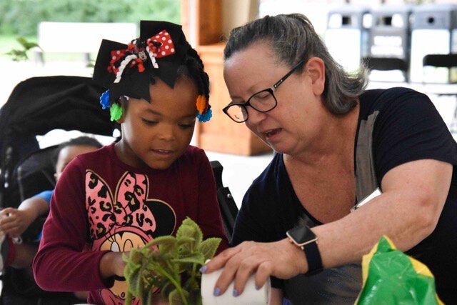Courtesy of MCREST – MCREST Support Services Coordinator Judy Dudek (right) teaches a young guest about plants