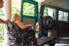Photo shows a woman using a wheelchair being pushed up a ramp into an accessible van.