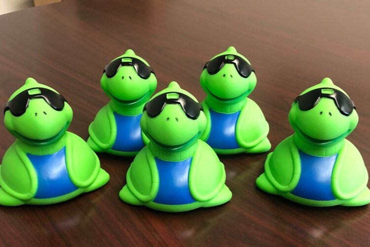 The bright green plastic turtles sporting black visor-style sunglasses are rented for the event. Each one is carefully numbered to help identify who adopted each turtle and to ensure none are left behind.