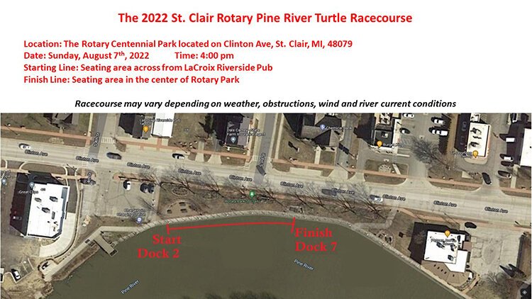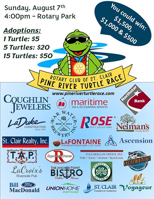Held along the Pine River at Rotary Centennial Park off of Clinton Avenue in downtown St. Clair, the event will begin at 4 p.m. on Sunday, Aug. 7. Following a roughly 500-foot journey through a lane created in the Pine River, cash prizes totaling $3,000 will be awarded immediately following the race to three individuals whose adopted turtle finished the fastest. First place will receive $1,500, second place $1,000, and third place $500.
