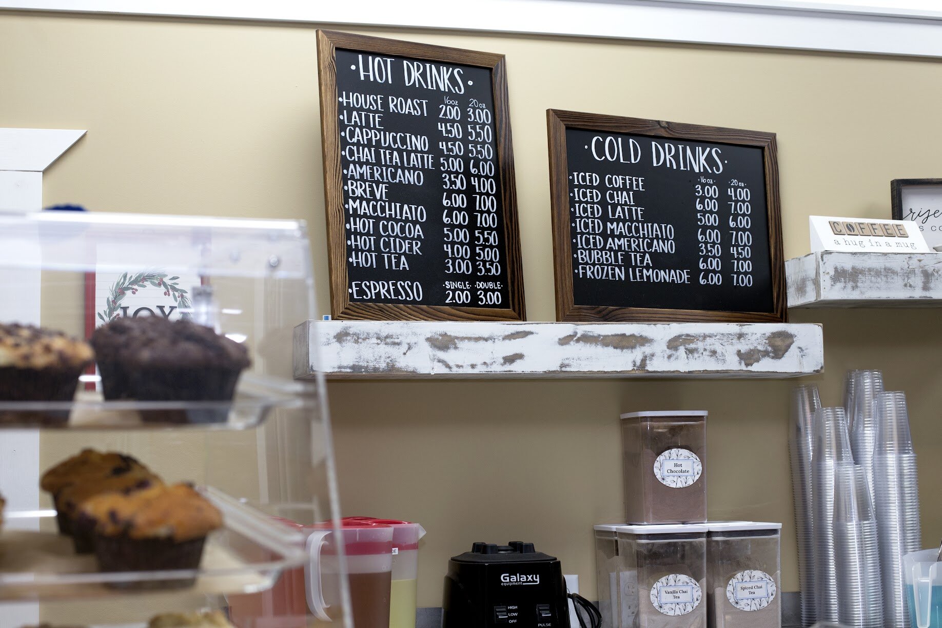 In addition to coffee, the cafe offers a wide array of hot and cold beverages ranging from lattes and tea to lemonade and bubble tea. To accompany any beverage, a display case filled with treats such as tiramisu, cinnamon rolls, and muffins are available to satisfy any sweet tooth.