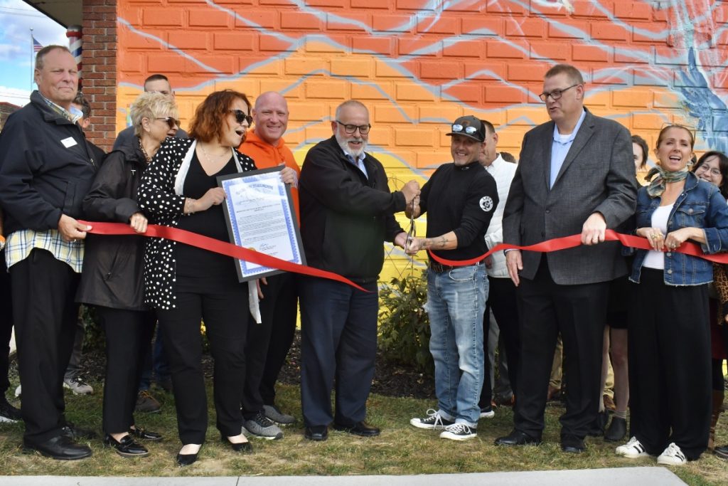 Mayor Gus Calandrino and artist Kevin Gano cut the ribbon.
