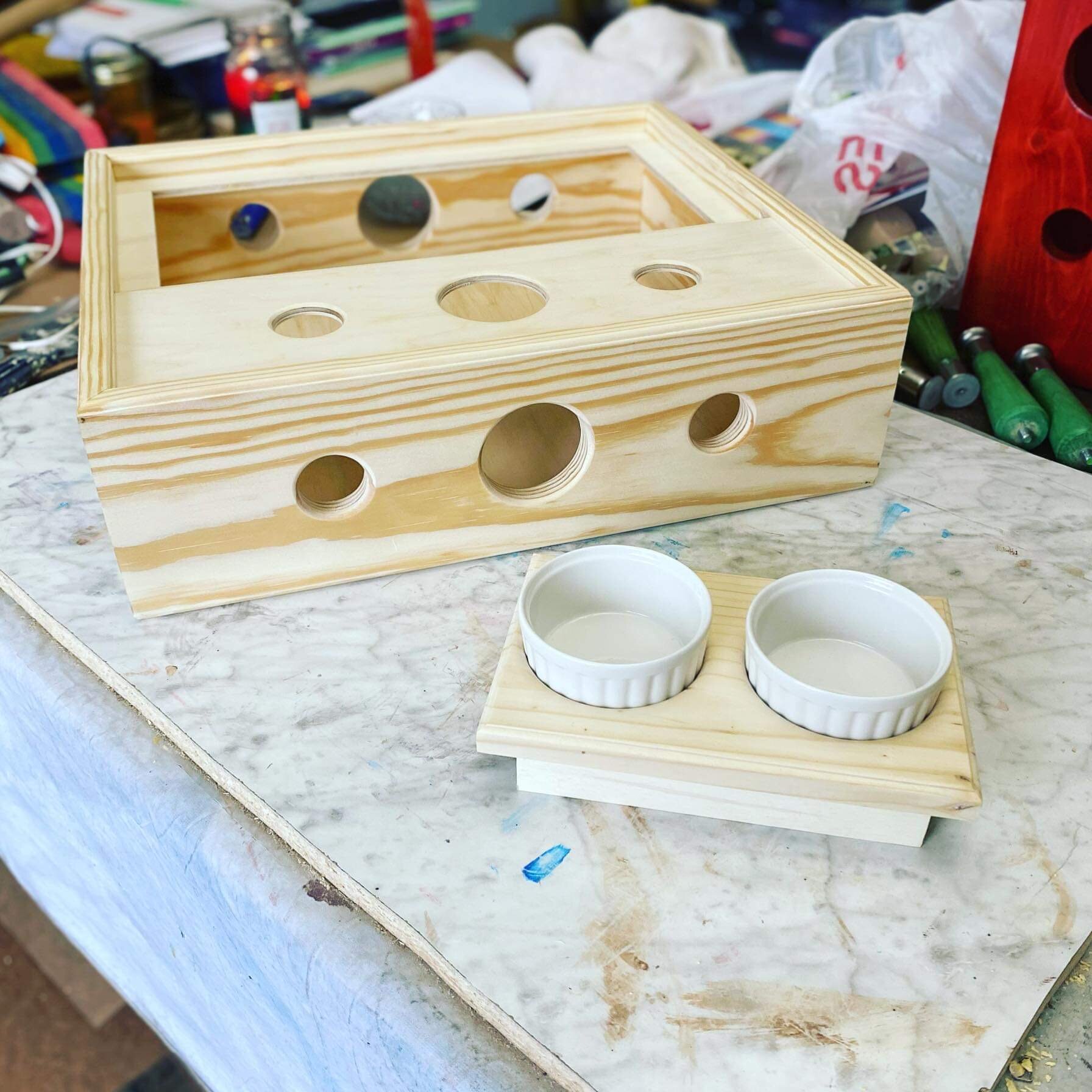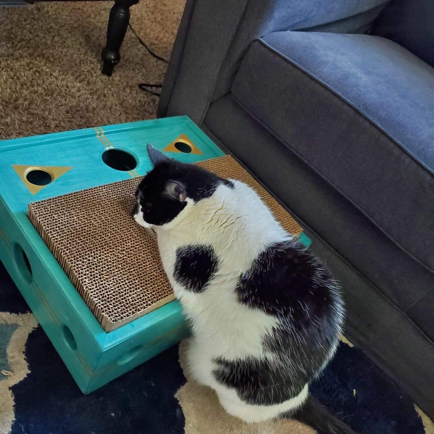 Missy: A few years ago, my family and I rescued three kittens that had been found on the side of the road without a mother. This was in addition to our senior kitty who will be 21 in May. As you can imagine, entertaining four felines can be a task in and of itself, especially three kittens. This led us to have some pretty creative ideas to help keep them active and healthy. In an attempt to create a kitty play box, I took a simple cardboard box, cut holes in it, and reinforced it to add stability; this was, ultimately, the first Good Good Kitty Box prototype. It was a hit; the kitties loved it. As it started showing wear, I thought “I should really make these out of wood so it lasts,” but I never seemed to find the time to do so. As the kitties grew, our household went through a lot of changes including moving out of our loft of 10 years right as we went into quarantine. This allowed me time to research, plan, and start building wood prototypes. Fortunately, I have a tremendous community of support and was able to get lots of feedback as I worked toward a final product.
