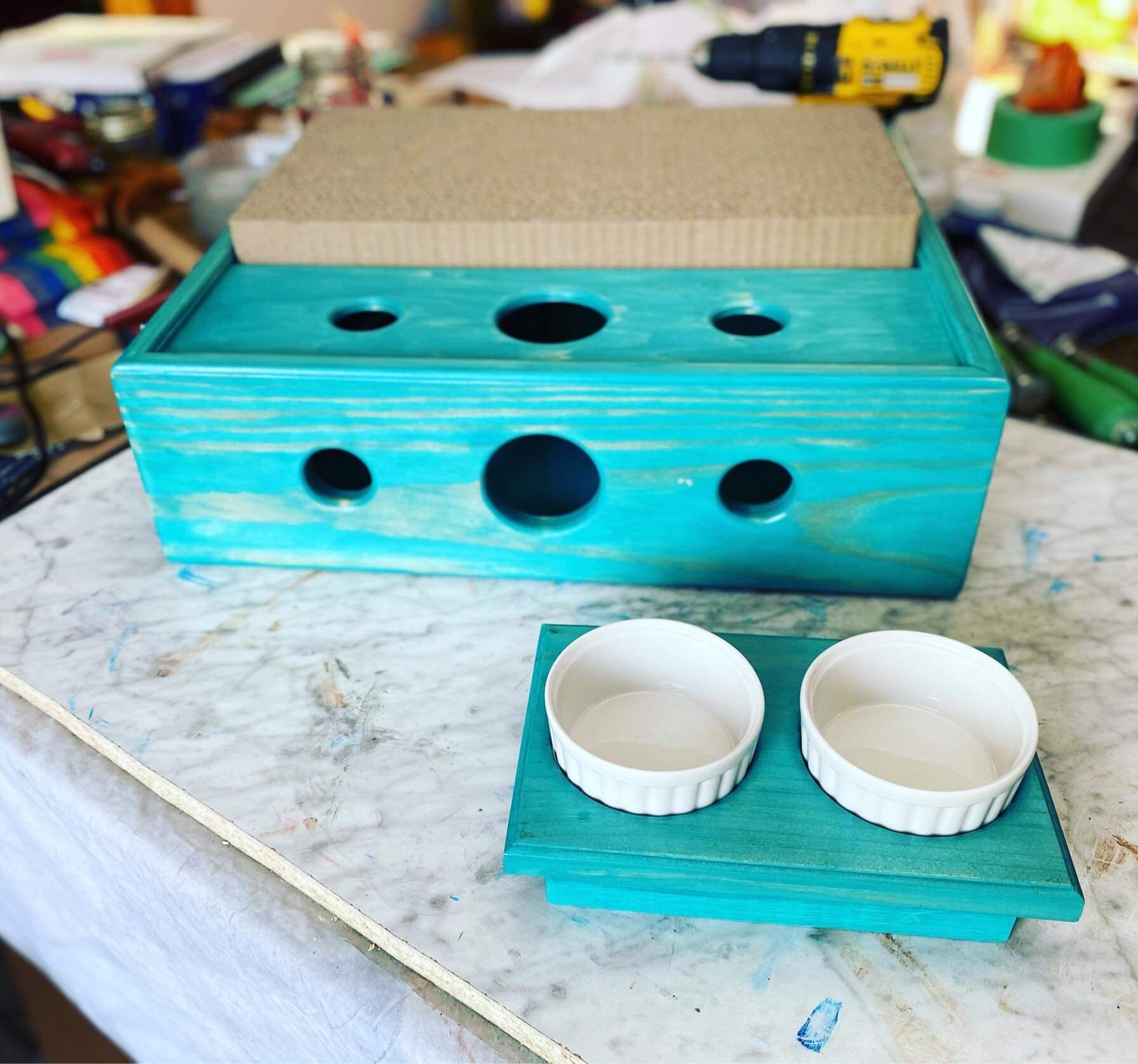 Missy: The final design came from a lot of trial and error and encouragement from my family. I went from sketching designs and hot gluing craft wood for prototypes, to investing in an entire workshop where I was able to create a finished product I was proud of. I have very high standards and if I was going to make them they had to be just right. Natural untreated wood, non-toxic stain and sealer, non-toxic glue and wood filler, well built, long lasting, reduced environmental impact, recyclable/compostable, customizable to your home, have storage, a scratch pad, be easy to clean up, can be put away, all while entertaining your good, good kitties. After months of hard work and testing, I finally did it!