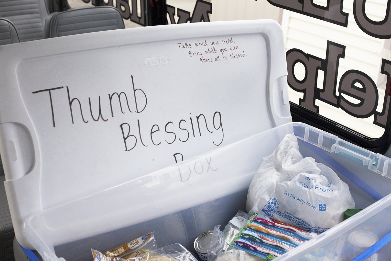 “When the crate gets full, the Thumbody Express bus stops by the farmers market and loads up the actual Thumb Blessing Box on the bus,” she says.